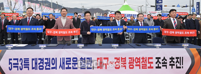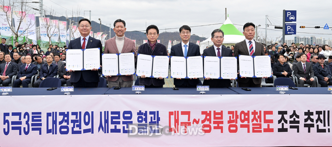 (데일리대구경북뉴스=김형만 기자)대구․경북 6개 지자체장은 2월 27일 오후 2시,‘대구~경북 광역철도 건설 조기 착공 공동 건의문 서명식’을 개최했다.