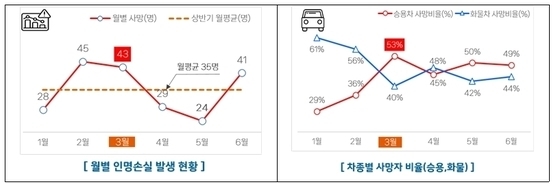 최근 3년간(’23~’25년) 3월 교통사고 사망자는 43명(3년 합계)으로 2월 교통사고 사망자(45명)와 비슷한 수준이나, 승용차 원인 사고 사망자는 월 전체 사고의 53%(23/43명)를 차지해 2월(36%, 16/45명)보다 크게 증가했다.