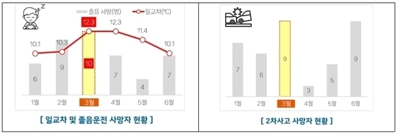 실제로 최근 3년간(’23~’25년) 3월에 발생한 졸음운전 사고 사망자는 10명, 2차사고 사망자는 9명으로 상반기 중 가장 많은 수준이다.
