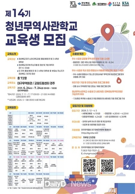 (데일리대구경북뉴스=김형만 기자) 경상북도는 한국표준협회 및 한국무역협회와 함께 실무형 청년 무역인재 양성을 위한 제14기 청년 무역사관학교 교육생을 모집한다.