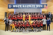 (데일리대구경북뉴스=이준호 기자) 대구 달성군(군수 최재훈)은 12월 5일 달성군청 군민소통관에서 ‘달성군청 유소년축구단’ 창단식을 개최했다고 밝혔다. 이날 창단식에는 선수 및 학부모와 최재훈 달성군수, 김은영 달성군의회 의장을 비롯한 김현우 달성교육지원청장, 김성제 달성군체육회장, 강성곤 달성군축구협회장 등 100여 명이 참석해 자리를 빛냈다. ‘달성군청 유소년축구단 U-12 화원’은 38명의 화원초등학교 학생 선수들로 구성되었으며 단장, 감독, 코치를 비롯한 지도진과 함께 지역 유소년 축구의 발전을 이끌 예정이다. 유소년 축구단의 창단은 지난해 화원초 축구부 인수와 창단 논의를 시작으로, 올 상반기 조례 제정과 예산 확보를 거쳐 이뤄졌다. 달성군과 대구시교육청은 지난 7월 업무협약을 체결했으며, 이번 창단식을 통해 그 결실을 맺었다. 최재훈 달성군수는 “이번 창단식이 지역 아이들이 자신의 꿈을 펼칠 수 있는 소중한 첫걸음이 될 것”이라며, “달성군은 앞으로도 아동과 청소년들이 건강하고 꿈을 키워가며 자랄 수 있도록 체육 환경을 지속적으로 개선해 나가겠다.”라고 말했다.